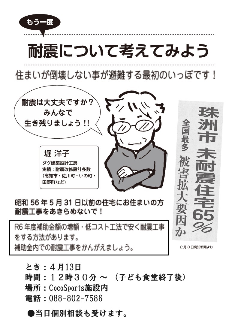 4月13日 耐震改修のはなし 今年度、高知市の木造住宅耐震改修工事補助金は10万上乗せで120万になっています。 耐震診断の費用は無料です。 先ずは耐震診断から初めてみてはいかがですか