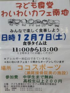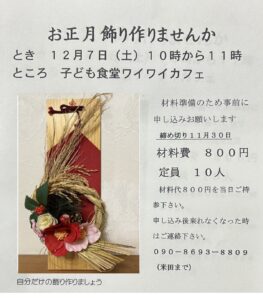 お正月飾り作り参加者現在4人です。参加者10名までですので、申し込み早めにお願いします。連絡は、CocoSportsまたは米田まで連絡ください。